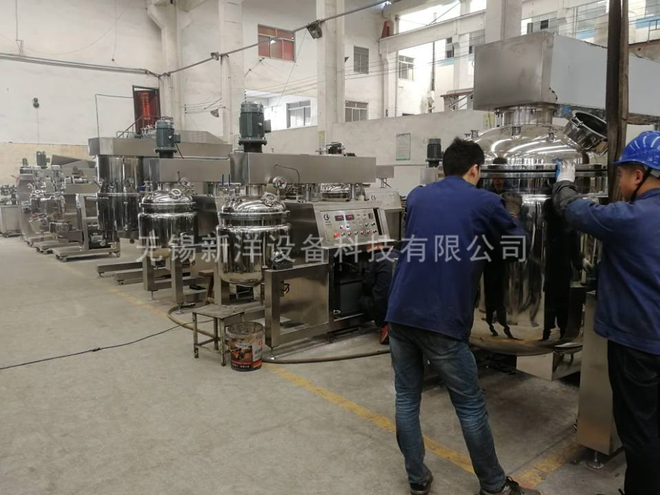 物料在水鍋、油鍋內(nèi)通過(guò)加熱、攪拌進(jìn)行混合反應(yīng)后,由真空泵吸入乳化鍋,通過(guò)乳化鍋內(nèi)上部的中心攪拌、聚四氟乙烯刮板始終迎合攪拌鍋形體,掃凈掛壁粘料,使被刮取的物料不斷產(chǎn)生新界面,再經(jīng)過(guò)葉片的剪斷、壓縮、折疊,使其攪拌、混合而向下流往鍋體下方的均質(zhì)器處,物料再通過(guò)高速旋轉(zhuǎn)的切割輪與固定的切割套之間所產(chǎn)生的強(qiáng)力的剪斷、沖擊、亂流等過(guò)程,物料在剪切縫中被切割,迅速破碎成200um-0.2um的微粒,由于乳化鍋內(nèi)處于真空狀態(tài),物料在攪拌過(guò)程中產(chǎn)生的氣泡被及時(shí)抽走。采用抽真空的方式,使所生產(chǎn)的制品在攪拌過(guò)程中不再混入氣泡,從而保證可制造出富有光澤、細(xì)膩及延展性良好的產(chǎn)品。