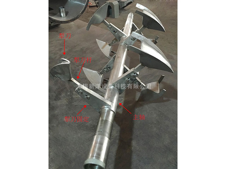 3、犁刀組軸:犁刀根據(jù)容積大小安排犁刀數(shù)據(jù),安裝在主軸上,在筒體內(nèi)作圓周運(yùn)動(dòng)混合物料。