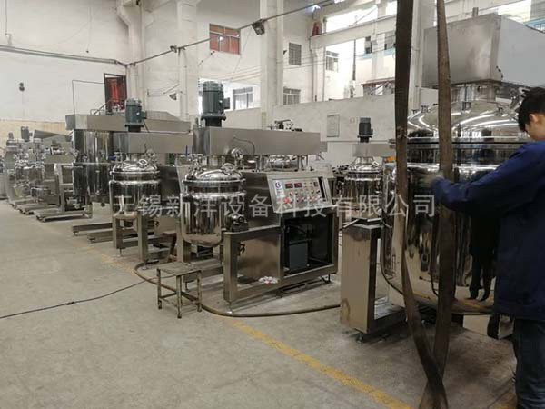 物料在水鍋、油鍋內(nèi)通過加熱、攪拌進(jìn)行混合反應(yīng)后,由真空泵吸入乳化鍋,通過乳化鍋內(nèi)上部的中心攪拌、聚四氟乙烯刮板始終迎合攪拌鍋形體,掃凈掛壁粘料,使被刮取的物料不斷產(chǎn)生新界面,再經(jīng)過葉片的剪斷、壓縮、折疊,使其攪拌、混合而向下流往鍋體下方的均質(zhì)器處,物料再通過高速旋轉(zhuǎn)的切割輪與固定的切割套之間所產(chǎn)生的強(qiáng)力的剪斷、沖擊、亂流等過程,物料在剪切縫中被切割,迅速破碎成200um-0.2um的微粒,由于乳化鍋內(nèi)處于真空狀態(tài),物料在攪拌過程中產(chǎn)生的氣泡被及時(shí)抽走。采用抽真空的方式,使所生產(chǎn)的制品在攪拌過程中不再混入氣泡,從而保證可制造出富有光澤、細(xì)膩及延展性良好的產(chǎn)品。